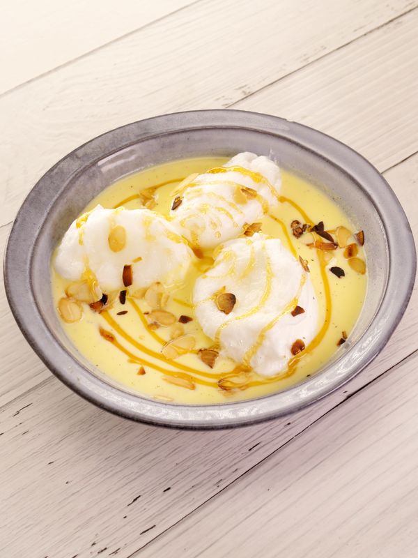 Steak avec un oeuf poché dessus, assaisonné au poivre et sel, accompagné de sauce à la viande.