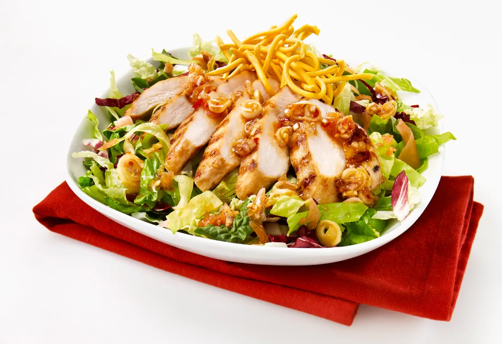Salade composée de poulet caramélisé, maïs, nouilles sautées au Satay et au soja, avec grande feuilles.